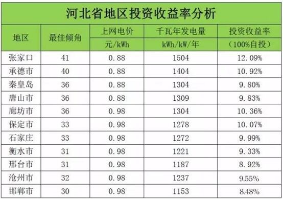 根據上表的數據可知,河北省的各個地市均高于行業內默認的8%投資收益水平,均具備開發條件。