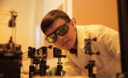 Hongrui Jiang觀察光源照亮新一代側(cè)向太陽(yáng)能電池的校準(zhǔn)情形。他與研究小組開(kāi)發(fā)的太陽(yáng)能電池可從入射光采集較現(xiàn)有技術(shù)更多3倍的電量。