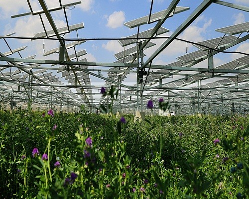 光伏板下的苜蓿綠浪翻滾