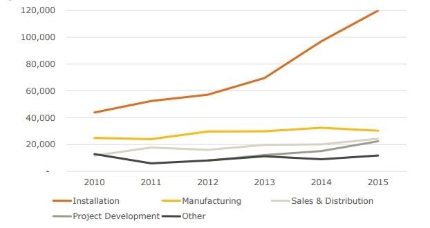 根據(jù)美國勞工部數(shù)據(jù),美國太陽能行業(yè)在2015年所創(chuàng)造的就業(yè)崗位超過美國油氣勘探和管道工業(yè)的總和,其增速更是美國經(jīng)濟增速的12倍。