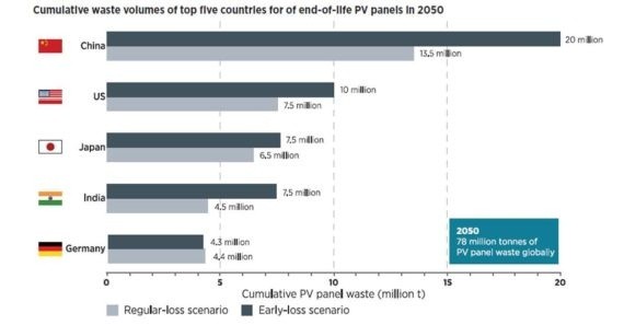 根據(jù)國際可再生能源機構(gòu)IRENA和國際能源署IEA聯(lián)合發(fā)布的報告顯示,截止2016年底,全球累計光伏廢棄產(chǎn)品將達到4.35-25萬噸,相當于累計安裝量的0.1-0.6%。但是到2050年,全球累計廢棄光伏材料將達到7800萬噸,其中,中國占1350-2000萬噸,美國占750-1000萬噸。