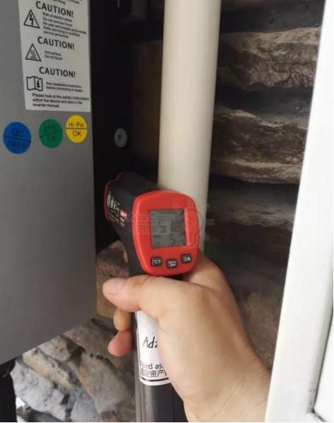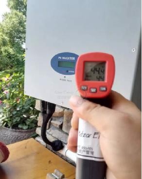 逆變器安裝在北面屋檐下,由于沒有太陽直射,輸出功率為80%,逆變器表面溫度為44.4度,比氣溫高5度左右,整體散熱性能良好。