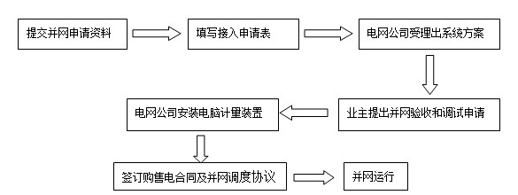 分布式項目業主在準備好相關資料后向電網公司地市或縣客戶報務中心提交接入申請,客戶服務中心協助項目業主填寫接入申請表,接入申請受理后在電網公司承諾的時限內,客戶服務中心將通知項目業主確認接入系統方案,項目建成后業主向客戶服務中心提出并網驗收和調試申請,電網企業將完成電能計量裝置安裝,購售電合同及調度協議簽訂,并網驗收及調試工作,之后項目即可并網發電。