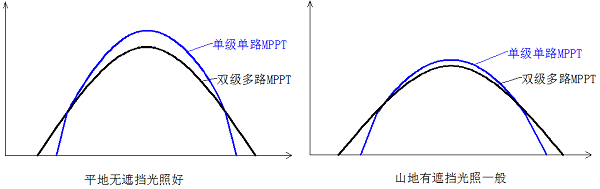 在山地或者屋頂有遮擋光照條件一般的地區(qū),雙級(jí)多路MPPT的逆變器發(fā)電量高。這是因?yàn)樵诘碗姽β拾l(fā)電時(shí)間段時(shí)間較長(zhǎng),高功率發(fā)電時(shí)間較短。