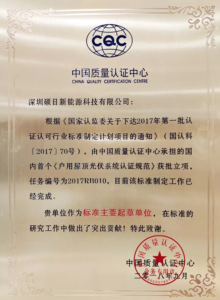 為提高戶用光伏安裝質量,確保光伏系統長期投資回報,迎接光伏平價上網時代的到來,CQC中國質量認證中心組織發起了《認證規范》的編制,碩日新能源作為CQC重點合作單位,全程攜手光伏行業重點單位共同編制,目前工作已經完成正在公示中。