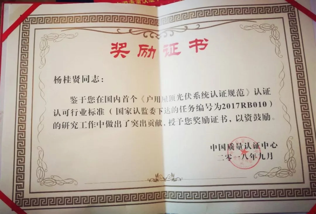 此次認證規范是根據國家認監委關于下達2017年第一批認證認可行業標準制定計劃項目的通知,由中國質量認證中心承擔的國內首個《戶用屋頂光伏系統認證規范》獲批立項。碩日新能源榮幸作為標準的主要起草單位,得到嘉獎贊揚并被授予獎牌和榮譽證書。