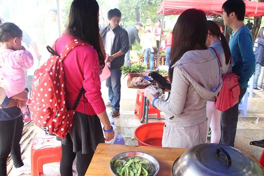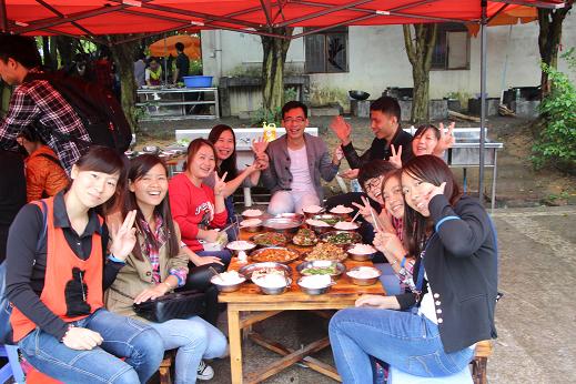 為了能盡快的享受到美食,各小組成員齊心協(xié)力,分工合作。有的洗菜、有的切菜、有的生火,有的炒菜……場面好比一場盛大的宴會。在各組成員的共同努力下,一桌桌豐盛的午餐出爐了,每個人都沉浸在美食的海洋中。