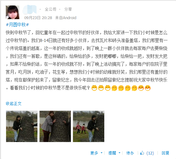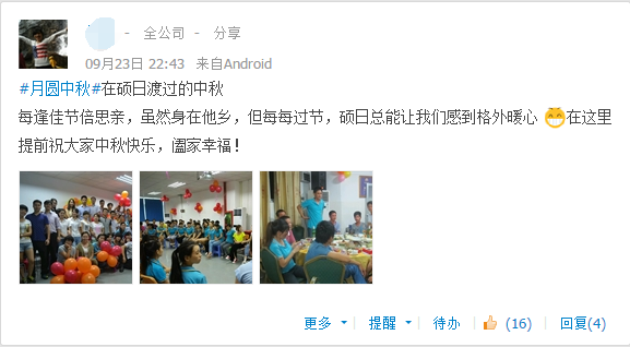 為了增強公司同事的交流與互動,營造中秋氣氛,公司開展了#中秋月圓#話題分享.通過同事的平臺分享,深感到中秋帶給我們的意義,在成長的道路上中秋節帶給我們感恩、感動、祝福以及無限美好的回憶。